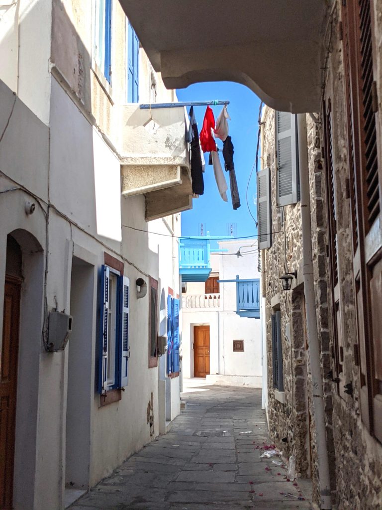 Sur les flancs du volcan, un joli village où le temps semble s’arrêté, figé. D’étroites ruelles désertes où on ne croise personne et des maisons blanchies à la chaux au pied du monastère dégagent encore plus ce sentiment d’isolement de cette île
