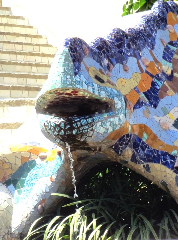 On se promène dans un décor enchanteur, magique, on aperçoit des maisons de contes fées comme celles d’Hansel et Gretel. On arrive sur sur une allée coiffée de colonnes torsadées qui ressemblent à des troncs d’arbres… Des troncs d’arbres transformés en colonne, ou l’inverse! Puis sur une terrasse où ondule un banc immense qui serpente comme un serpent et qui offre une splendide vue panoramique sur le parc et la ville. Partout des céramiques multicolores chatoient sous le soleil comme sur le banc mais aussi sur les fontaines placées à l’entrée du parc.