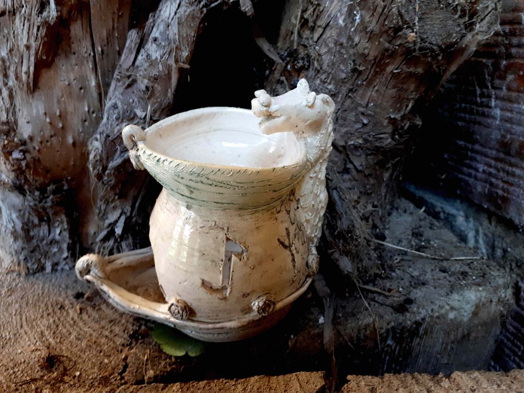 Décors de couleurs naturelles et cuit 2 fois dans le four à environ 1000 degrés. Il est vitrifié pour pouvoir le nettoyer facilement.