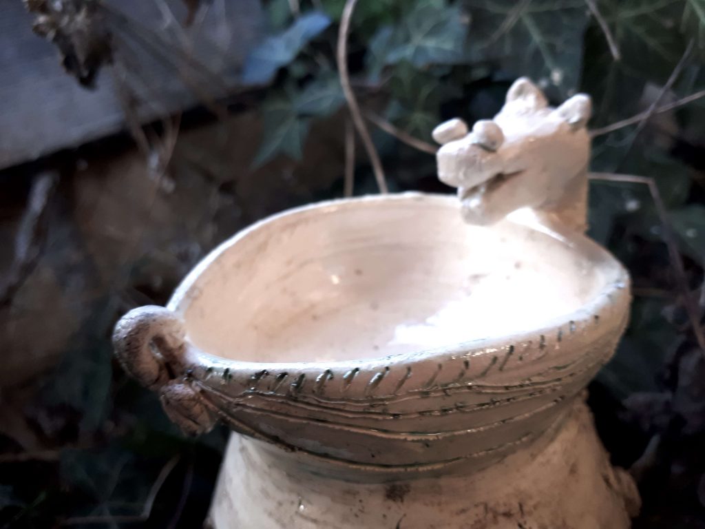 En forme de bateau de viking, j’ai sculpté un dragon qui veille sur la coupelle destinée à recevoir les huiles essentielles ou une bougie.