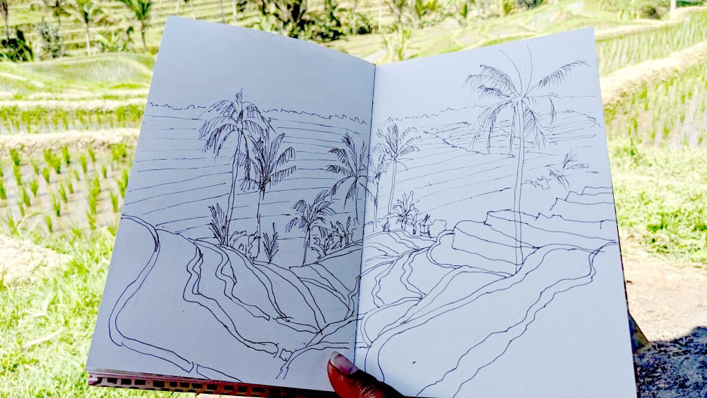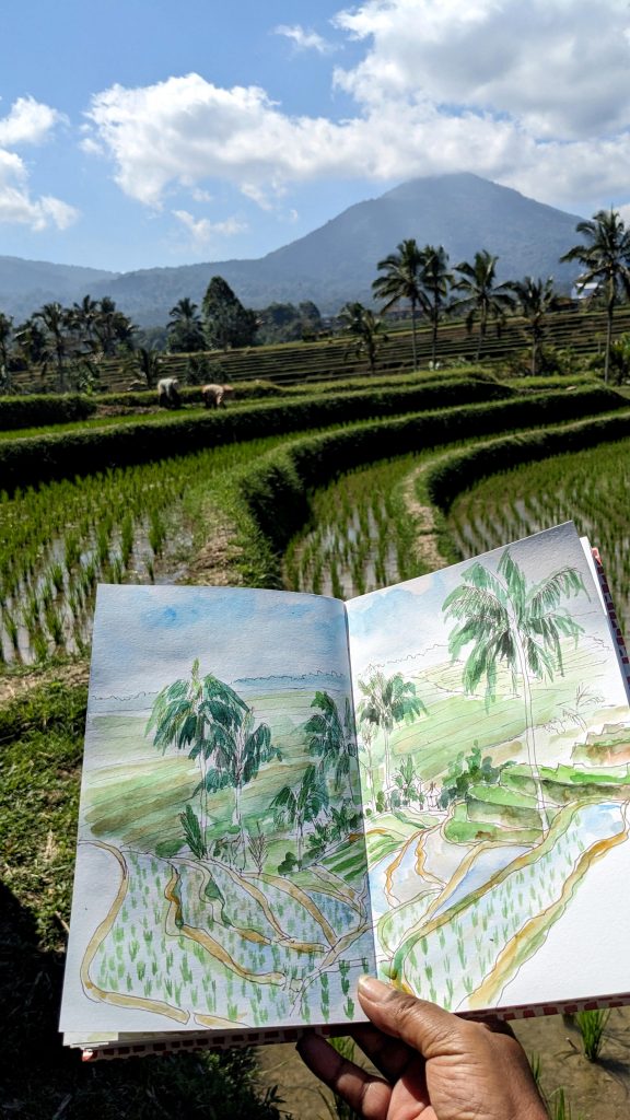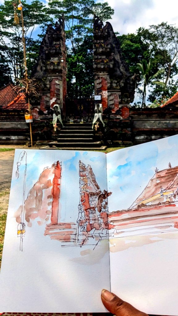 Voici quelques aquarelles faites à Bali. Je ne suis restée que brièvement à Bali, que je connaissais déjà, partant vers les îles de Flores et de Lombok plus à l’est. J’ai quand même eu le temps de dessiner sur quelques lieux emblématiques et d’autres moins fréquentés.
