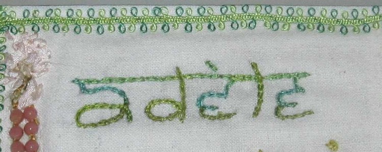 Tableau de naissanc e pour un de mes amis. Le fond est brodé entièrement, le cadre est fait de collages de lettres indiennes.