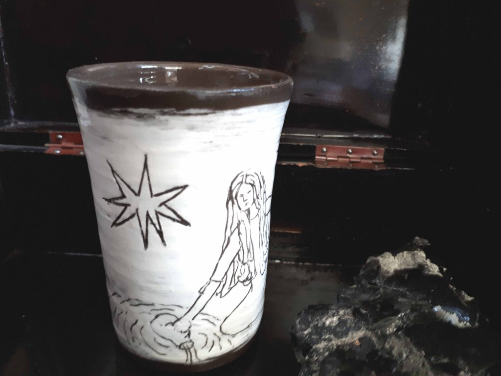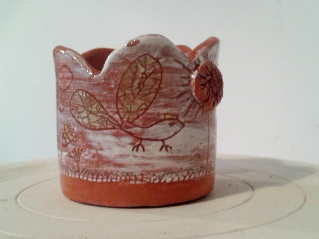 La technique la plus utilisée c’est celle de la terre vernissée. On recouvre une pièce réalisée en argile rouge d’un engobe blanc que l’on pourra ensuite graver et décorer avec d’autres engobes colorés.